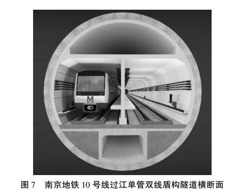 南京地铁 10 号线过江隧道工程,盾构刀盘直径11. 57 m,盾构段隧道长 3 600 m,埋深 58 m,为国内最早穿越长江的水下大直径地铁盾构单管双线隧道工程。 该工程于 2012 年开工,2013 年竣工,是我国当时施工难度最大、地质条件最为复杂的过江盾构隧道。 其修建为我国水下地铁单管双线隧道提供了设计施工经验,其后国内修建的南京地铁 3 号线过江隧道、杭州地铁 1 号线过江隧道、广州地铁 4 号线南延段隧道、武汉轨道交通 8 号线越江隧道、大连地铁5 号线海底隧道等借鉴了其横断面的设计方案(如图7 所示) 。