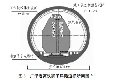 广深港高铁狮子洋隧道是世界首座高速铁路水下盾构隧道,也是我国建成的最长水下隧道和首座铁路水下隧道,其横断面见图 8[12]。 该隧道为双洞单线隧道,是广深港高速铁路关键控制性工程,其穿越地质与环境条件极为复杂的珠江入海口———狮子洋,设计行车速度为 350 km / h,盾构段长 9 277 m,为国内首次连续穿越软弱地层、土岩复合地层、基岩及其破碎带的大直径盾构,水压力为 0. 67 MPa,是当时国内水压力最大的盾构隧道。