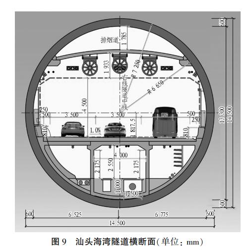 3. 4 双管单层 3 车道双向 6 车道公路隧道汕头海湾隧道设计为双管双向 6 车道海底公路隧道,隧道横断面如图 9 所示。 盾构隧道单线长 约3 047. 50 m, 其中, 西线采用我国自主研究制造的15. 03 m 岩石复合常压刀盘泥水盾构,东线采用海瑞克制造的泥水盾构。 该隧道是我国第 1 条地处 8 度抗震设防烈度区的超大直径海底盾构隧道。