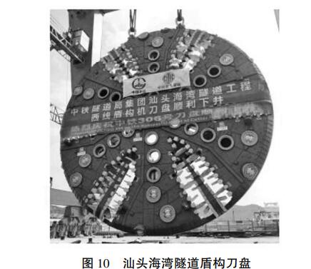 汕头海湾隧道有 “ 大、 高、 硬、 浅、 险” 等特点。“大”指泥水复合常压刀盘盾构直径大,达 15. 03 m,为超大直径盾构;“高”指海湾隧道位于高地震烈度区,地震烈度达 8 度;“硬” 指隧道穿越孤石和海中基岩(花岗岩)段,岩石强度高,达 130~160 MPa;“浅”指盾构隧道覆盖层厚度浅;“险”指盾构隧道地层复杂,施工难度大,风险高,隧道穿越软硬不均地层及 3 段长达182 m 的基岩花岗岩凸起段。汕头海湾隧道西线采用的泥水盾构(常压刀盘)是我国中铁工程装备集团有限公司自主研发制造的首台超大直径 15 m 级盾构,盾构刀盘如图 10 所示。