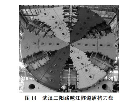 排烟通道,中间层为三阳路公路 3 车道行车道,下层为地铁 7 号线行车道及逃生、电缆和排烟通道,其剖面如图 13 所示。 该工程采用 15. 76 m 超大直径盾构施工,盾构刀盘如图 14 所示。