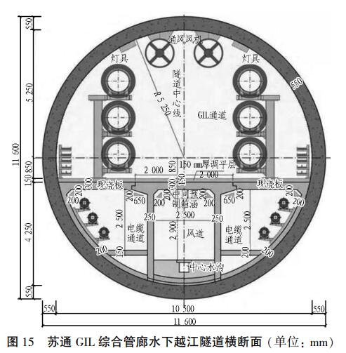 世界首条超高压苏通 GIL 综合管廊水下越江隧道[13]是淮南—南京—上海 1 000 kV 交流特高压输变电工程的控制工程。 其采用盾构法施工,盾构段长5 469 m,最大水压力 0. 8 MPa,盾构刀盘直径 12. 07m,采用 2 层布置,上层布置 2 回路 GIL 管道及运输安