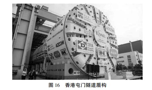 2015 年,香港屯门至赤鱲角连接线隧道工程开始掘进,工程采用 1 台直径达 17. 60 m 的盾构( 见图 16)和 2 台直径 14 m 的盾构施工,其中,17. 60 m的盾 构 直 径 超 过 了 西 雅 图 SR99 工 程 中 直 径17. 45 m 的盾构,成为当今世界上直径最大的盾构。隧道从较硬的花岗岩到较软的次固结海相沉积岩地层,从透水性强的沉积砂砾层到透水性弱的黏土变质沉积岩地层。
