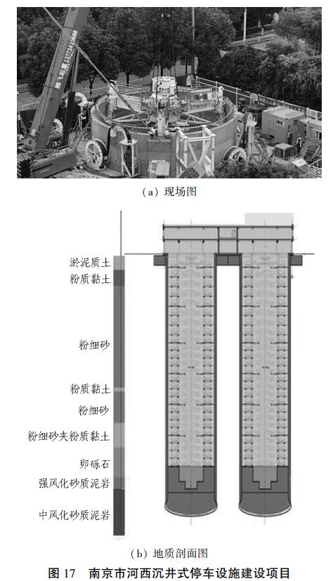南京市河西沉井式停车设施建设项目,是我国首次采用海瑞克垂直竖井掘进机(VSM)施工的工程,现场及地质剖面见图 17。 竖井内径 12. 00 m、外径 12. 80m,隧道开挖直径 13. 00 m,开挖深度 67 m。 施工中穿越多种地层,有厚达 35 m 的粉细砂层、厚达 10 m 的卵砾石层,最后进入砂质泥岩层。 隧道底部采用 6 m 厚混凝土封闭,并施作钢筋混凝土底板。 相较于传统的明挖工艺,VSM 工法具有适合多种地质条件下开挖作业、开挖速度快、占地面积小、低排放、低噪音、对周围建筑影响小等优势。