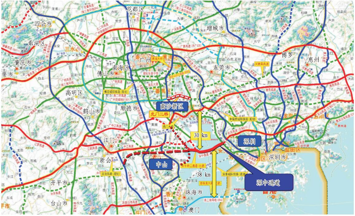 深中通道位于粤港澳大湾区核心战略区域,北距虎门大桥 30 km,南距港珠澳大桥 38 km,是国高网 G2518(深圳—广西岑溪)跨珠江口关键控制性工程,是“十三五” 国家重大工程。 深中通道地理位置见图 1。