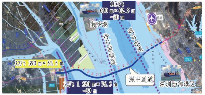 1)处于珠江口门、粤港澳大湾区核心位置,建设条件极为复杂。 项目起点位于深圳机场南侧,航空限高决定了项目东侧只能采用隧道方案,同时也对伶仃洋大桥桥塔高度以及投入到附近区域的施工装备高度提出了限制性要求; 项目线位穿越 7 条航道,其中矾石航道、伶仃西航道是珠江口的出海主航道,通航等级高,是世界最繁忙航道之一,这就决定了跨(穿) 越航道的桥梁净高及隧道埋深,且通航安全管理问题突出;项目位于珠江口门,所处区域台风等异常极端灾害气候频发,对伶仃洋大桥主梁抗风性能提出了极高的要求,对主桥及沉管浮运沉放施工带来了巨大挑战; 项目处于珠江口东四口门出海口河口湾,防洪纳潮敏感,阻水比控制严格; 项目穿越国家一级保护动物中华白海豚洄游区,区域内环保要求高。 工程海域航道情况示意图见图 5。