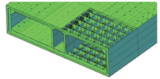 2)世界首例双向 8 车道海底钢壳沉管隧道,钢壳混凝土沉管国内首次应用、国际首次大规模应用,综合技术难度高,极具挑战性。 为适应项目沉管隧道超宽、变宽、深埋、大回淤技术特点,本项目在世界上首次应用了双向 8 车道超大跨钢壳混凝土沉管隧道结构型式[4-5](见图 6),设计、预制及浮运安装难度极大,在结构设计上缺乏成熟的规范与标准,也面临着自流平混凝土制备及质量控制难度大等诸多难题;同时,隧址区地质条件复杂,存在挖砂坑范围大、基槽回淤强度高、粉砂层地震液化、风化层软硬不均等诸多不利因素,超深挖砂坑软弱淤泥层的地基基础沉降控制、病害诱发机制和主动防控技术面临巨大挑战;受航道水深条件、干坞预制场选址条件制约,预制场距离隧址达 50 km,长距离管节浮运、长达 5 km 基槽横拖及穿越繁忙伶仃航道等不利因素,给沉管浮运和安装带来极大挑战。