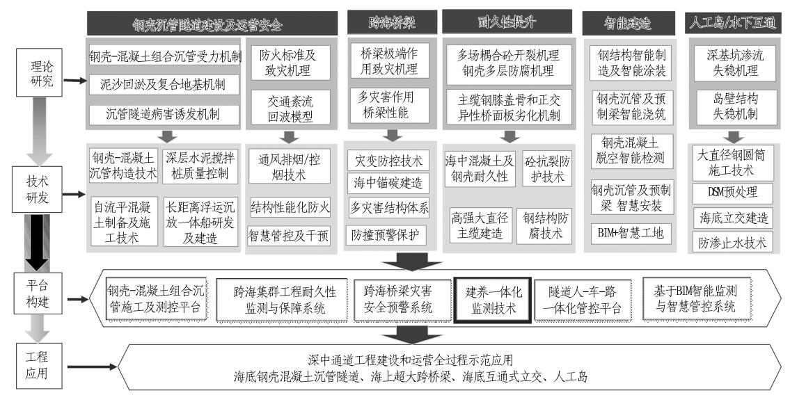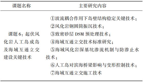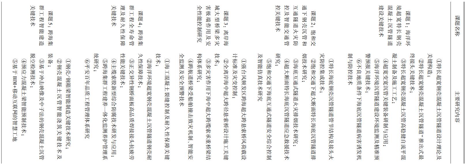 5) 设立 6 项课题。 设立钢壳混凝土沉管、运营安全、海中悬索桥、耐久性保障、智能建造、风化岩地基人工岛成岛及海域互通立交等 6 大课题。