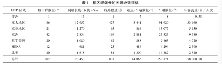 所收集的数据按城市群定义汇总,即使这些系统是在不同的城市中运营(为简化起见,下文“城市群”与“城市”互换使用)。247个城市轨道网络可归入202个城市群,为11.2亿居民提供地铁服务。