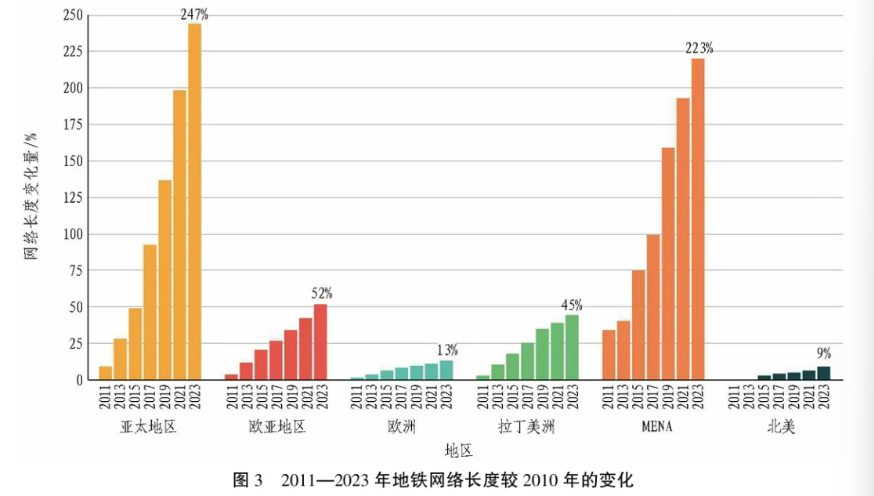 图3示出了与2010年相比的各区域地铁网络长度变化情况,柱状图对应于从2011年开始的奇数年份(2011、2013、2015、2017、2019、2021和2023年)。将2023年的数据与2010年相比,MENA以及亚太地区在开通地铁长度方面增长最高(MENA增长223%,亚太地区增长247%)。从数据上看,中国推动了亚太地区的地铁网络增长;卡塔尔、阿拉伯联合酋长国(UAE)、巴基斯坦和伊朗的新开通线路和扩建项目推动了MENA地区的增长,预计随着当前在建项目的完成,将持续增长。2023年与2010年相比,欧亚地区和拉丁美洲在增长方面排名第3和第4,远低于亚太地区和MENA地区(欧亚地区增长52%,主要由土耳其、俄罗斯和乌兹别克斯坦推动;拉丁美洲增长45%,由巴拿马、秘鲁和厄瓜多尔的新网络以及巴西的扩建项目推动)。欧洲和北美地区的增长率最低(欧洲为13%,北美为9%)。