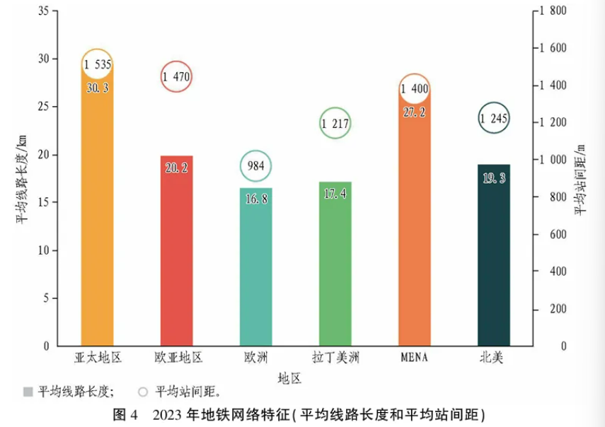 与2018年UITP世界地铁数据相比,仅亚太地区数字略有变化,平均线路长度从2017年的26 km增至2023年的30.3 km,站间距从1 414 m增至1 535 m。过去6年所有其他区域数据几乎没有变化。