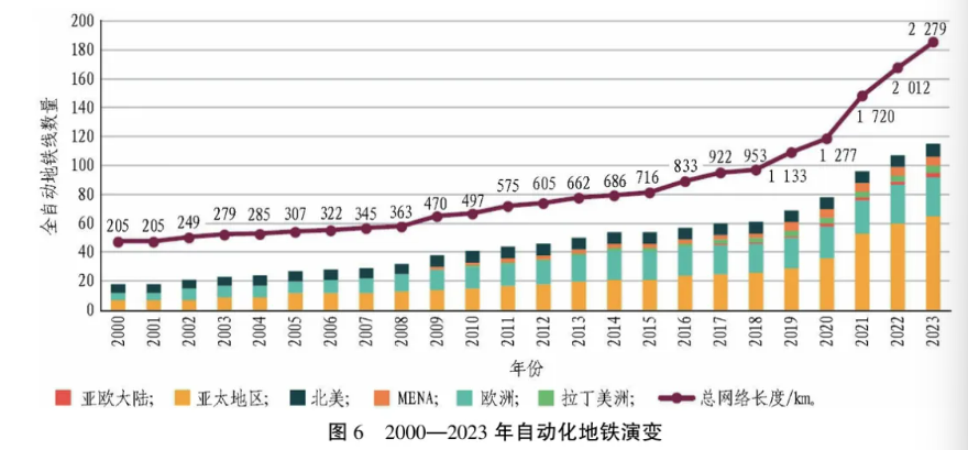 2023年,拥有至少1条全自动地铁线(GoA4)的城市群数量持续增加,达60个;而2000年仅13个城市群有GoA4线。图6示出了按区域和年度划分的GoA4线路数量增长情况。