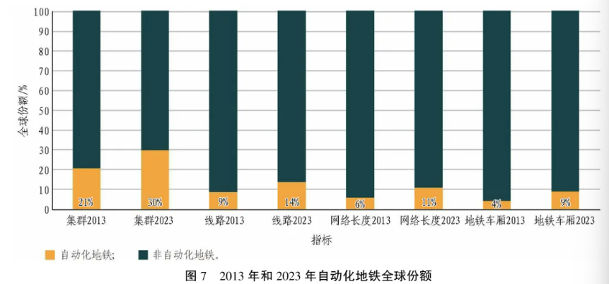 2023年全球自动化线路总长2 279 km(占全球地铁总长的11%,如图7所示)。地铁自动化始于1981年,但近年屡创纪录。2020—2023年,自动化地铁长度增长75%,由亚太地区推动,该区域自动化线路最集中(占全球总数的57%),网络最长(占全球总公里数的67%)。欧洲自动化线路占全球的23%,但因线路较短,仅占地铁总长度的15%。城市层面,2023年,中国自动化地铁网络规模(公里数)全球第1,随后是韩国、法国、新加坡和马来西亚。