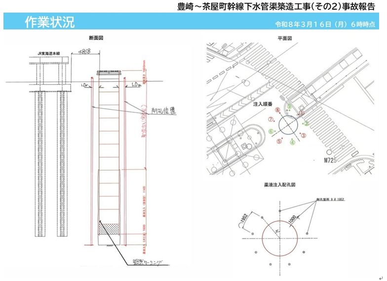 事现发生于2026年3月11日上午6时左右,为钢套管内部排水作业次日,工作人员发现钢套管冲破沥青路面,出现在新御堂筋高架道路下方。