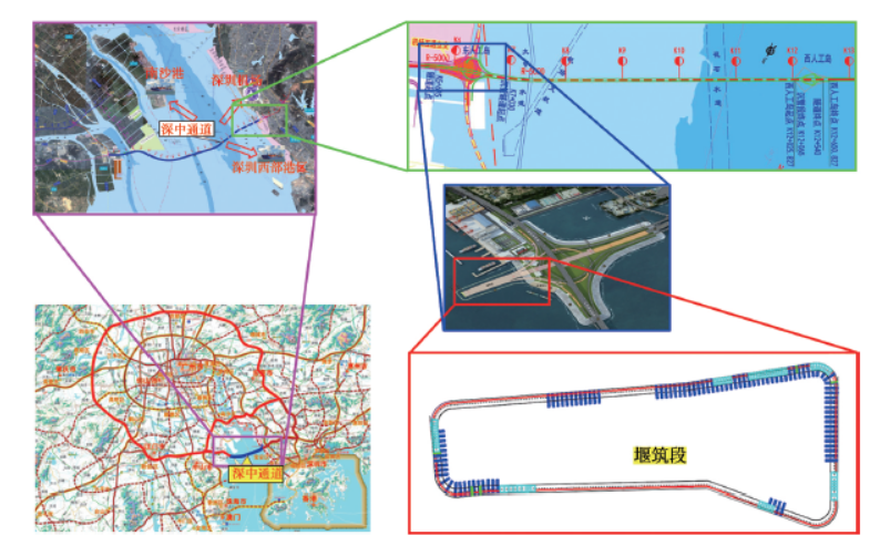 鉴于此,本文依托深中通道东人工岛堰筑段隧道工程[,通过文献调研、项目类比、现场实践等方法,结合相关工程设计及地质勘察资料,梳理项目实施过程中的施工关键技术,如复杂海域超宽围堰设计、海域超宽围堰施工及稳定性控制、异形深大基坑开挖组织、海域隧道结构大体积混凝土防裂抗渗,形成一套复杂海域条件下超宽堰筑法隧道施工关键技术,以期为后续相关工程建设提供借鉴和参考。