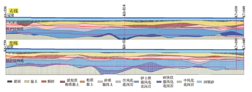 工程所在地隶属华南褶皱系,地质条件相对复杂,地层复杂多变,其中淤泥层最大厚度达15 m,具有含水量高、孔隙比大、压缩性高、强度低、渗透性低、承载力低、易触变与流变等特点。工程区间地质纵断面如图2所示,地层自上而下依次为回填中粗砂层、淤泥质土层、黏性土与砂类土层、花岗岩残积土层,底部为全风化花岗岩、强风化岩层和中风化岩层,以中风化岩层为主,堰筑段隧道岩土层特征见表1。详勘及补勘资料揭示,场地淤泥层厚度变化大、分布广泛,在工程所在地东北部、西南角范围均分布有深厚淤泥,导致地基稳定性极差,承载力为35~60 kPa,在荷载作用下易发生侧向滑移、挤出及不均匀沉降,进而导致围堰与基坑施工面临显著的不均匀沉降风险。