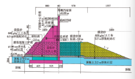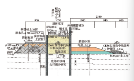 堰体标高+3 m,堰顶标高+6 m,堰宽10 m。钢板桩长度为30~33 m,内外排钢板桩之间采用钢拉杆连接,堰顶设L型扶壁式挡墙,围堰内采用膜袋砂反压以及膜袋混凝土护面,堰体内海平面以下8 m采用中粗砂换填,局部软弱土层采用旋喷桩加固。