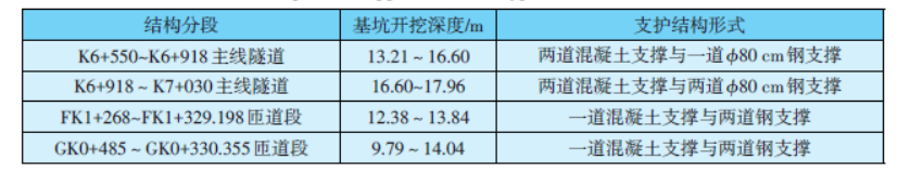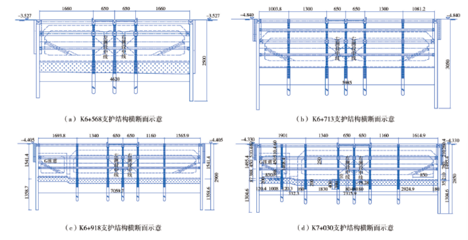 针对东人工岛堰筑段隧道工程地质条件复杂、地下水丰富、淤泥层厚度大且分布不均、水位波动大的工程重难点,基坑支护采用1 m厚地下连续墙和钢管桩两种形式(图6)。其中匝道、②号基坑和③号基坑开挖深度较浅(13.21~16.60 m),支护结构采用一道混凝土支撑与ϕ80 cm钢支撑;①号基坑开挖深度较大(16.60~17.96 m),支护结构采用两道混凝土支撑与ϕ80 cm钢支撑。各段基坑开挖深度及支护结构形式见表2,部分里程处支护结构横断面如图7所示。可以看出,随着基坑开挖深度的不断加大,基坑支护主要通过增设ϕ80 cm钢支撑进行加强。