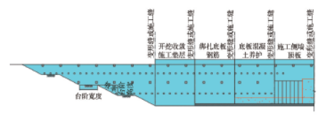 单个基坑形成止水封闭后进行土方开挖及内支撑施工,各基坑均由西向东(由深到浅)单作业面施工。开挖前进行坑内预降水,土方采用分层分段台阶法开挖,遵循“分层、分步、对称、平衡、限时”原则,坑底土方开挖、封底与主体结构底板施工流水作业,直至完成基坑开挖。基坑纵向施工工序如图10所示。