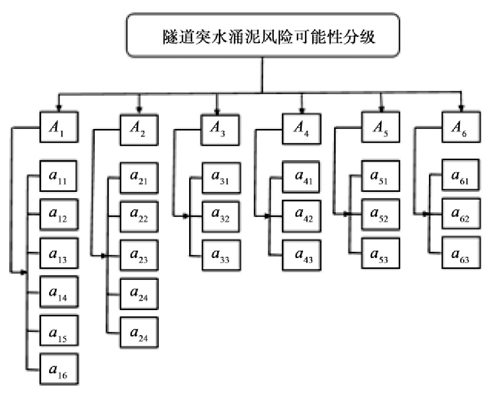 隧道突水涌泥风险分级评估的递阶层次结构模型如图1,评价准则见表1。