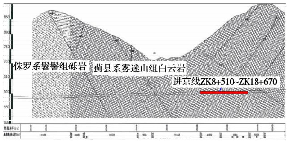 延崇高速公路(北京段)工程第6标段全长5 501 m,位于延庆的张山营镇内,其中玉渡山隧道为项目的重难点。该隧道为双线分离式隧道,进京段起止桩号为ZK16+358-ZK20+965,全长4 607 m,出京段起止桩号为YK16+342-YK21+022,全长4 680 m。隧道洞身主要是Ⅳ、Ⅴ级围岩,Ⅲ级围岩极少,以白云岩为主。白云岩属可溶性岩层,可能会有岩溶伴生。隧道穿越地层主要为蓟县系雾迷山组(Jxw4),地势起伏,植被茂密,地下水充沛,如图2所示。
