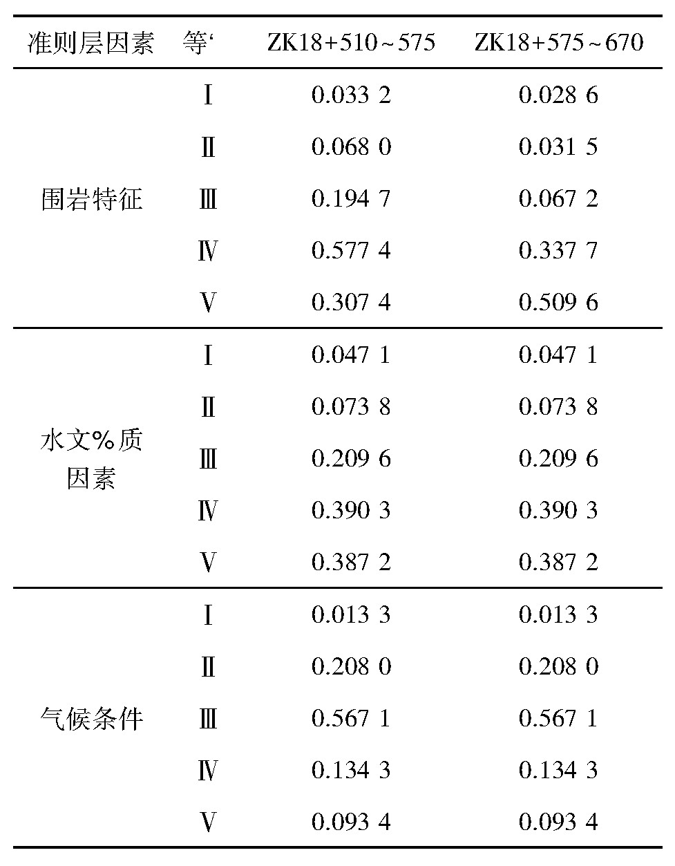(3)根据上述隧道突水涌泥模糊综合评价集,因0.447 6>0.315 0>0.247 4>0.094 1>0.046 2,0.382 9>0.369 2>0.216 1>0.087 1>0.043 2,由最大隶属度原则可以判断,隧道ZK18+510~ZK18+575、ZK18+575~ZK18+670段的突水涌泥风险等级均为IV级,即很可能发生突水涌泥灾害。根据隧道施工安全等级,采取相应的支护方案及注浆堵水方案的防护措施,以确保工程施工及隧道使用的安全。