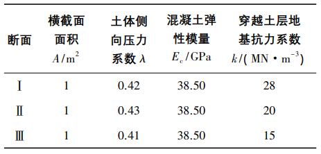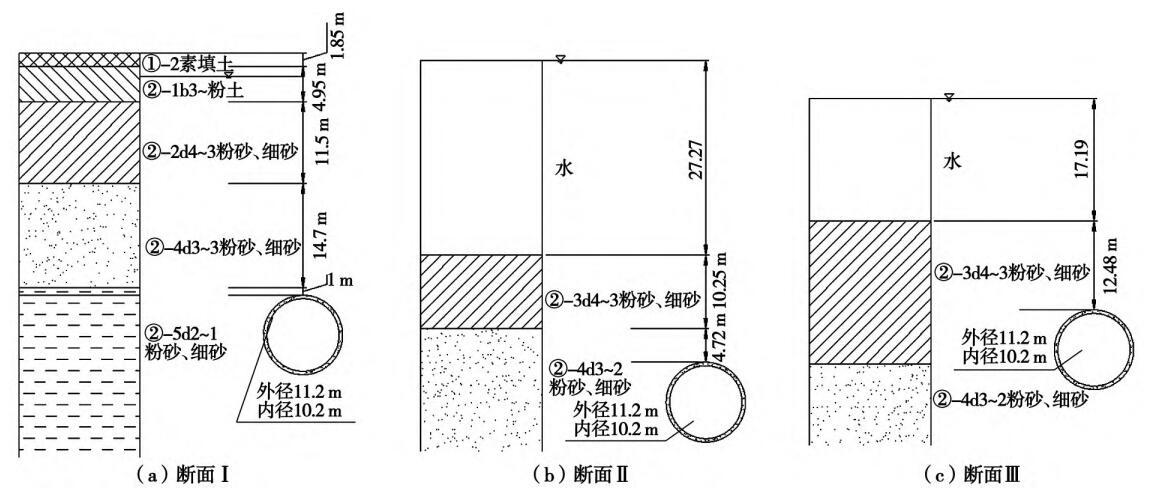 试验环号分别为第479、1 094环和1 384环,断面Ⅰ深埋隧道变形监测剖面位于479环,断面Ⅱ中埋隧道变形监测剖面位于1 094环,断面Ⅲ浅埋隧道变形监测剖面位于1 384环,其地质断面如图2所示,其中第479环位于岸边,1 094及1 384环为江中段,隧顶上覆土埋深分别为34.1 m、14.97 m、12.48 m, 3个典型断面位置处隧顶覆土埋深与盾构外径之比分别为3.04、1.34、1.11,覆土厚度大于(1~2)D(D为管片环外径),当覆土厚度和隧道外径相比较小时,一般不考虑土拱效应,采用全覆土压力作为垂直土压力。管片外荷载采用松弛土压力和全覆土土压力进行计算,采用水土分算法计算隧道衬砌承受的水土压力,盾构隧道穿越的土层多为粉砂、细砂。对探孔进行取样、统计分析,通过直剪快剪试验,采用多级荷重下的抗剪强度回归计算得到c、φ值,通过室内物理力学指标、杆长修正后的标准贯入锤击数N、重型动力触探锤击数标准值推荐确定土体的基本承载力值,此外根据土体固结试验数据加权平均得到弹性模量E,相应的主要物理力学指标见表1。