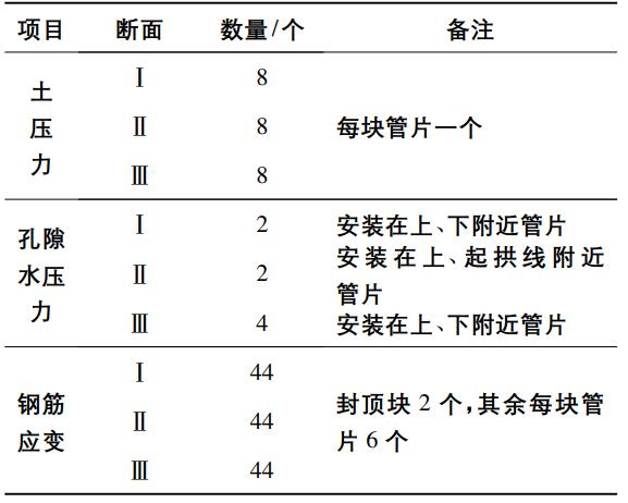 为了获取管片环在安装稳定后其外部荷载及结构受力情况,本次监测内容包括周边土压力、水压力、管片内外侧主钢筋应变值,如表2所示。管片土压力通过预先埋设在管片上的土压力盒直接量测,水压力通过埋设在管片外侧的孔隙水压力计进行测量。此外,钢筋应变值通过频率接收传感器进行监测,定时测量。为了研究土压力以及钢筋应力的分布情况,传感器应尽量考虑沿圆周均匀布置,如图4所示,同时结合管片分块情况,尽可能使每块管片上都埋设有传感器。此外,通过在管片内部布置钢筋计,量测管片内钢筋应变进而反算管片内力,由于施工等因素的影响,部分传感器在施工过程中失效。