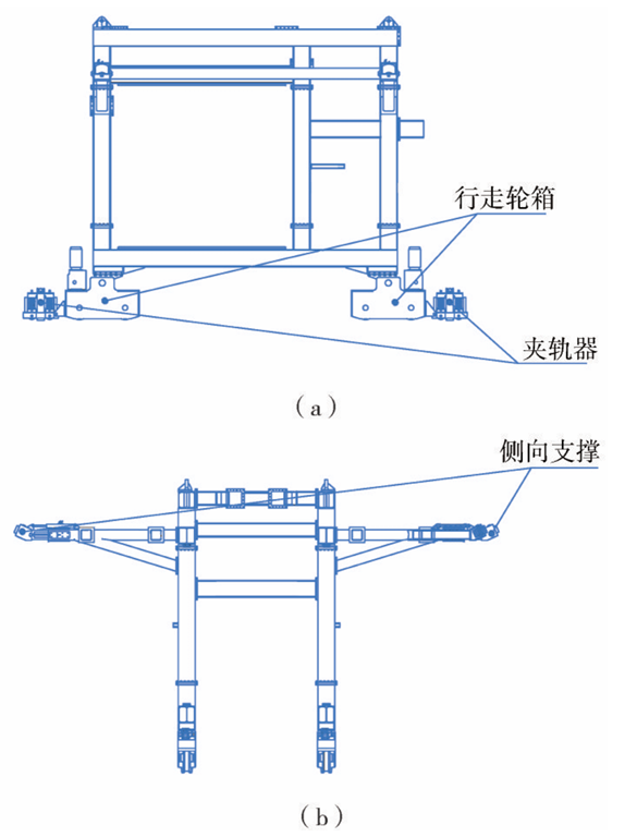 完成拼装设备车架研发后,需对设备的抓取系统进行细化。在车架两侧中部设置辅助车架,其是实现中隔墙抓取、翻转和精调的核心部件。通过下部行走架与中隔墙拼装设备车架连接,以同样实现沿Z向移动的功能。辅助车架设置有提升架、弓形梁、伸缩架、中隔墙抓取机构等构件。中隔墙抓取机构包括插销、控制中隔墙各自由度的油缸、端面限位、旋转限位等装置。辅助车架示意如图6所示。