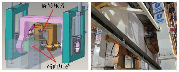 (4)弓形梁中的端面限位油缸和旋转油缸依次伸出并固定,完成对中隔墙宽度和厚度方向的限制(图16);