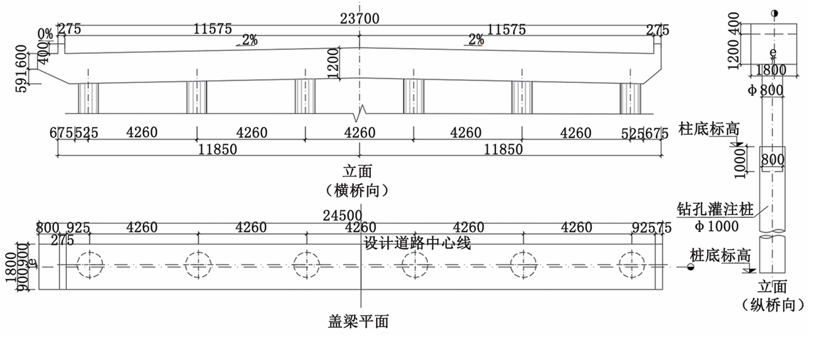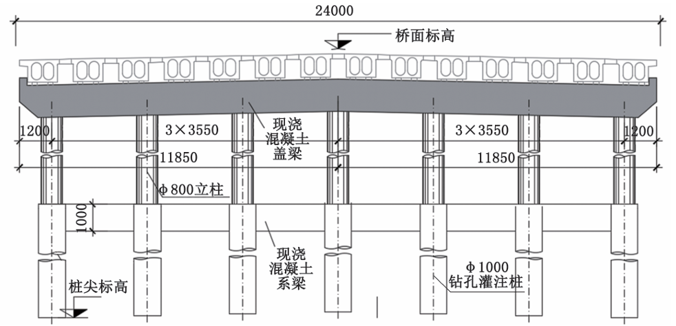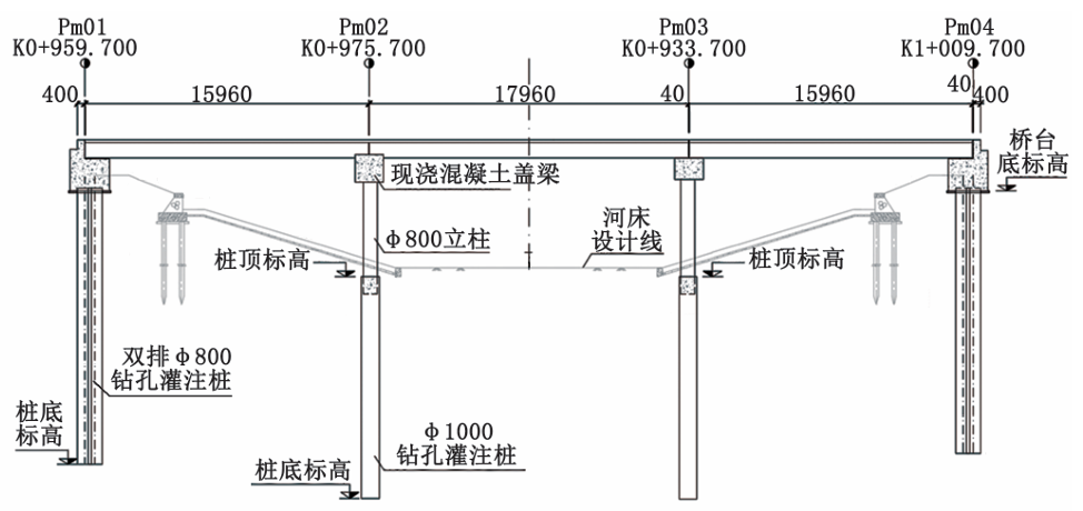 临港重装区D32(E61-E7)市政道路工程西起E7路,东至E61路,规划等级为城市支路,其红线宽度为24m,全长约1.55km,并且与横向道路形成平面交叉。本工程于小泐港新建桥梁1座,小泐港桥为3跨(16m+18m+16m)结构简支,桥面连续的结构形式。桥梁基础为钻孔桩基础,排架墩,一柱一桩,桩间设系梁,轻型埋置式桥台,盖梁为现浇钢筋混凝土盖梁,桥跨结构采用先张预应力空心板梁。小泐港桥结构如图1、图2所示。