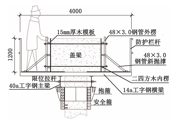 抱箍体系由安全箍、抱箍、主梁、横梁、盖梁模板及防护栏杆等组成,抱箍体系构造如图5所示。