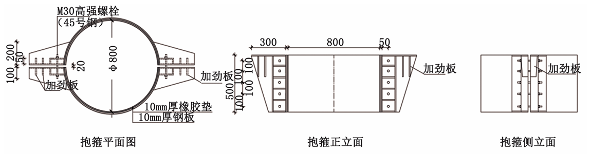 受力箍采用2块厚度为10mm的半圆形钢板制成,抱箍内贴1层10mm厚的橡胶垫,通过平头螺栓与抱箍紧密连接。这层橡胶垫的高度为50cm,其硬度需保持在(60±5)°,拉伸强度不低于9MPa,扯断伸长率需达到或超过375%。抱箍本身的高度也是50cm,而且每个抱箍都通过10个10.9级的M30型高强度螺栓连接。