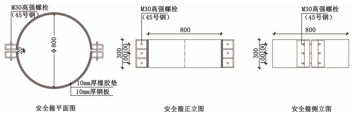 下层的安全箍高度为30cm,使用6个10.9级M30型高强度螺栓进行固定。受力箍及安全箍构造如图6、图7所示。