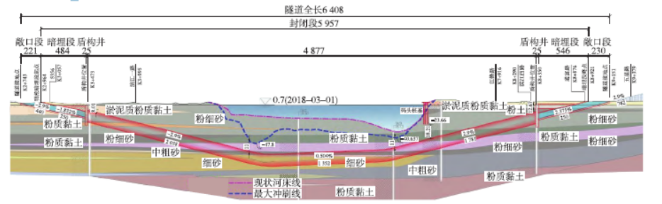 隧道盾构段长4877 m,穿越地层主要为粉质黏土、粉砂、粉细砂和中粗砂,如图1 所示,隧道承受最大水压超过0. 8 MPa,最大覆土厚度约50 m。隧道下穿长江深槽,河势、航道条件复杂,上方河床变动大,结构受力复杂多变。