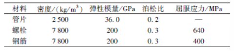 采用荷载-结构法建立相邻3 环管片的三维有限元计算模型,如图2 所示。管片采用C60 高性能混凝土,每环由1 块封顶块、2 块邻接块和7 块标准块组成,环宽2 m,采用六面体实体单元模拟。每环分布有ϕ25@ 143 mm 钢筋2 根和ϕ25@ 100 mm 钢筋14 根,均为HRB400E 级;螺栓选用8. 8 级M36 斜螺栓,每环管片环向螺栓30 个,分3 排布置,纵向螺栓56 个,钢筋与螺栓均采用梁单元模拟。混凝土材料采用塑性损伤本构模型,钢筋和螺栓采用理想弹塑性模型,材料物理力学参数如表1 所示,管片之间设置摩擦接触,并通过螺栓连接,采用接地弹簧模拟地层抗力,弹簧刚度根据各土层的基床系数计算得到。