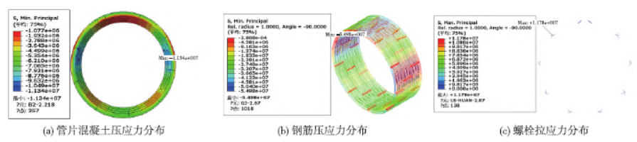 以断面YK4+959 为例,该断面结构采用水土分算,拱顶水压高达507. 1 kPa,在设计荷载下管片、钢筋和环向螺栓的应力云图如图4 所示。结构整体受压,拱腰处管片最大压应力为11. 34 MPa,最大钢筋压应力54. 98 MPa,螺栓最大拉应力为11. 78 MPa,与现场实测左右拱腰内侧管片混凝土压应力12. 3 MPa、钢筋压应力72. 6 MPa、环向螺栓拉应力9. 1 MPa 基本一致,验证了模型的可靠性。