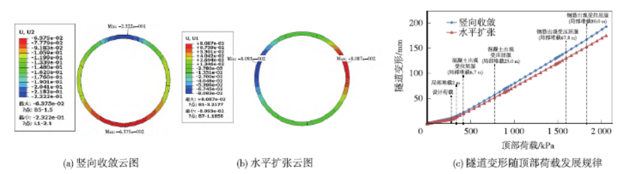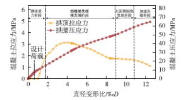 ①弹性受力阶段(0~1. 46‰D):变形初期混凝土和钢筋压力稳定增长,拉应力基本分布于管片接缝位置,水平扩张和竖向收敛同步发展,变形模式表现为“横鸭蛋”模式;达到临界点时,拱顶内侧位置的混凝土出现拉伸屈服。