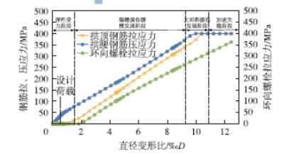 结构钢筋拉、压应力和环向螺栓拉应力随竖向直径变形比的变化规律如图6 所示。加载过程中钢筋压应力始终大于拉应力,临近失稳时先出现受压屈服,随后出现受拉屈服。拱顶内侧钢筋拉应力在直径变形比10. 39‰D 时首先达到屈服强度,结构在拱顶位置发生受拉破坏失稳;拱腰内侧钢筋压应力在直径变形比9. 98‰D 时首先达到屈服强度,结构在拱腰位置发生受压破坏失稳。而拱底位置较为安全,钢筋拉、压应力均未达到屈服强度。