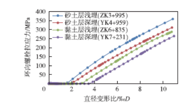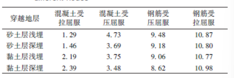 总结四个断面结构在不同节点下的竖向直径变形比,如表3 所示。可以发现,混凝土受拉屈服时砂土层断面的结构直径变形比为1. 29‰D 和1. 46‰D,而黏土层断面为2. 19‰D 和2. 39‰D,砂土层断面结构变形较小;浅埋断面结构直径变形比在混凝土受拉屈服时略小于深埋断面,而钢筋受压屈服时略大于深埋断面,说明随着材料屈服比例增加,不同断面结构的直径变形比趋于相同。