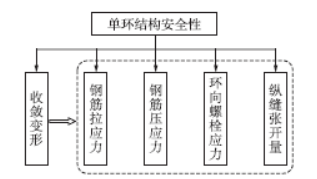 因此,基于健康监测和精密测量数据,选取收敛变形指标、钢筋拉应力、钢筋压应力、环向螺栓应力、纵缝张开量5 项指标评价单环结构安全性,同时考虑收敛变形指标与其余指标间的相关性,建立针对盾构隧道单环结构的安全性能评价模型,如图10 所示。