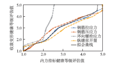 式中,y1、y2、y3、y4、y5 分别为收敛变形、钢筋拉应力、钢筋压应力、环向螺栓应力、纵缝张开量的健康等级评估值;x1、x2、x3、x4、x5 分别为各项指标的拟合系数。拟合系数的几何意义表示收敛变形指标评估值与其余指标的近似度,拟合系数越大表明该指标与收敛变形指标的发展趋势越接近,指标间相关性越大。