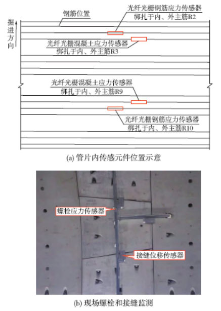 (1)江阴靖江长江隧道工程江阴靖江长江隧道建设工程中,监测断面管片预埋健康监测传感体系,用于隧道建设期和运营期的管片内力实时监测,监测内容主要包括水土压力、应力、有害气体、渗漏水、非预埋结构状态测试、沉降。对于隧道管片单环状态监测,每间隔一块管片在内、外侧各预埋两组混凝土应力传感器和钢筋应力传感器,环向螺栓垫圈中布置压力传感器,管片纵缝位置布置微小