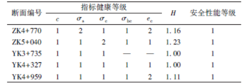 分别对各断面的指标监测数据进行健康等级评估,并通过公式计算得到单环结构安全状态等级,如表6 所示。可以发现,结构安全性能等级均为1 级,表示该环隧道结构性能完好,符合建设期隧道结构状态规律。其中存在个别指标测值较大导致指标健康等级较大的情况,原因包括应力测值受到施工扰动产生波动、管片初始拼装误差等。