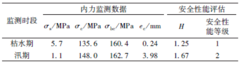 南京市纬七路长江隧道采用盾构施工方法横跨长江,隧道外径14. 5 m,穿越土层透水性良好,承受水压力较大。为进行南京长江隧道结构安全评估方法研究,整理了隧道左线断面LK3+759 在不同时段的内力测值。由于缺失隧道整体收敛变形数据,因此收敛变形指标权重应按比例分配到其余指标上,即钢筋拉应力、钢筋压应力、环向螺栓应力、纵缝张开量指标权重为0. 10 ∶ 0. 44 ∶ 0. 25 ∶ 0. 21。各项内力监测数据与安全性能评估结果如表7 所示,可以发现,断面在枯水期时结构安全性能完好,汛期时结构安全状态出现轻微破坏,与文献中的评价结果一致。