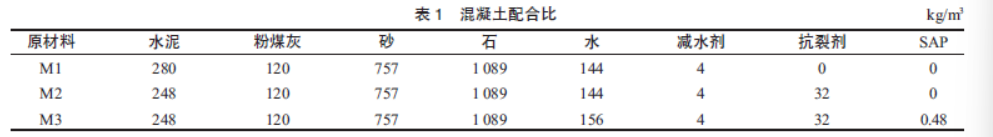 配合比参照明挖段主体结构侧墙配合比设置,见表1,基准混凝土编号为M1,掺加HMEⓇ-V抗裂剂的混凝土编号为M2,同时掺加HMEⓇ-V抗裂剂及SAP 的混凝土编号为M3,其中,HMEⓇ-V抗裂剂的掺量占胶凝材料的8%,SAP掺量占胶凝材料的0.12%,在室内试拌混凝土的基础上,控制减水剂掺量及混凝土坍落度为(180±20)mm,测得SAP吸水倍率约为25 g/g,因此,向掺加SAP 的混凝土额外引入了12 kg/m3 的拌和水。