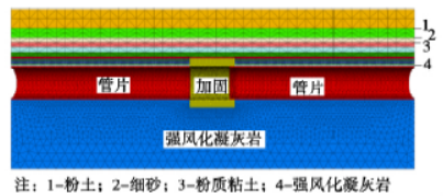 为了研究覆岩厚度对围岩稳定性的影响,分别建立了隧道上方岩层厚0 m、0.5 m、1 m、1.5 m、2 m、3 m、4 m、6 m、8 m、10 m 的模型,岩层上方依次为粉质黏土( 厚度11.5 m) 、细砂( 4 m) 、粉土地层( 7.8 m) ,并分别对不同覆岩厚度的模型进行流固耦合计算。图3 给出了覆岩厚度为0.5 m 的模型。本小节以覆岩0.5 m 的模型为例,具体分析围岩位移、海底地层沉降、隧道围岩变形及土压力随施工过程的变化规律。