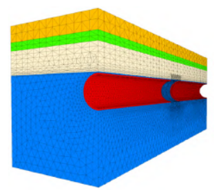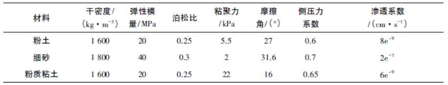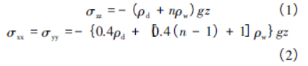 土体的原始计算条件为: 模型运行之前需计算土体竖向和侧向的初始地层应力,模型的水面位于土面以上25m,土体完全饱和,土体的初始平衡计算静止侧压力系数取0.7,即σxx =σyy = 0.7σzz,竖向和侧向应力计算公式如下