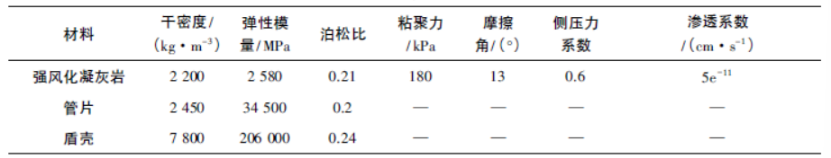 地层采用摩尔库伦弹塑性实体单元模拟,管片采用弹性模型实体单元模拟,管片厚度为60 cm,盾壳采用结构壳( shell) 单元模拟。土体参数根据地勘资料确定,土层根据实际地层分布设置。模型中土体、盾壳及管片的具体参数如表1 所示。流体模型参数设置( 采用常用值) 为: 流体密度= 1 000 kg /m3,流体模量Mf = 2 000 MPa。