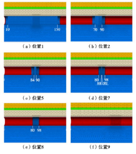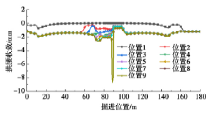 图4 给出了覆土厚度为0.5 m 盾构掘进至不同位置时的围岩变形云图。位置1 时左右两台盾构机相距140 m,相互影响很小,可以看出两侧盾构前方围岩变形云图相似,拱顶位置有一定沉降,拱底区域土体出现小幅回弹隆起。从位置1 掘进到位置2 时,两台盾构相距20 m,此时右侧盾构机停机,两侧土体开始相互扰动。随着左侧盾构继续掘进,刀盘前方围岩变形云图重叠,相互影响逐渐加强,上部土体受影响范围逐渐增大。由于左侧盾构机继续掘进,右侧刀盘前方土体受到挤压作用,且未进行超前地质加固,所以开挖面土体位移较大。当掘进至位置8 时,左右两台盾构刀盘开始接触,并拆除两侧刀盘,此时两侧盾壳相距2 m,两侧盾壳未焊接时,此段地层为临空面,拱顶土体沉降突然增大至96.56 mm,如图5 所示。位置9 为两侧盾壳焊接,并浇筑对接段衬砌,土体最大位移降至94.1 mm。由此可见,对接拆机时两盾壳间的围岩变形很大,因此需要对围岩进行超前加固,并及时焊接两侧盾壳。